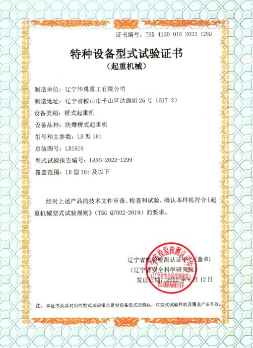 LDP電動(dòng)單梁型式試驗(yàn)合格證